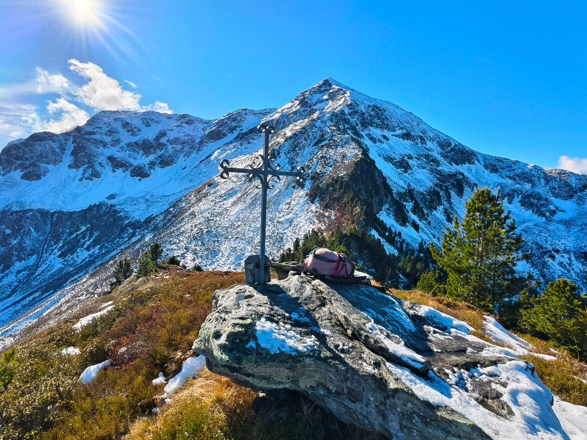Hike: um 9.40 Uhr am AV-Steig in der SO-Flanke empor, viele Almrosen und alleinstehende Zirben > Abzweiger alleinstehende Zirbe 1845 m > nach links zur Mareitlacke 1900 m – rund um den zugefrorenen See ca. 15-20 cm Schnee > mühsam weglos im Schnee steil empor zum Sattel bzw. der Grathöhe 1955 m > am SW-Grat den Gratsteig entlang, ein Felskopf wird auf der Südseite umgangen > Mareitkopf 2004 m: 310 Hm auf km 1.5 – um 10.55 Uhr erreicht – schönes geschmiedetes kleines Eisenkreuz auf einem Felsblock – tolle Aussicht, schöne Jungzirben – 30minütiger Abstieg über AV-Steig zum Raddepot: gesamte Runde 310 Hm auf km 2.7, ca. 1 ½ Stunden GZ – gemütliche Rast auf dem idyllischen Mareitalm Hochleger