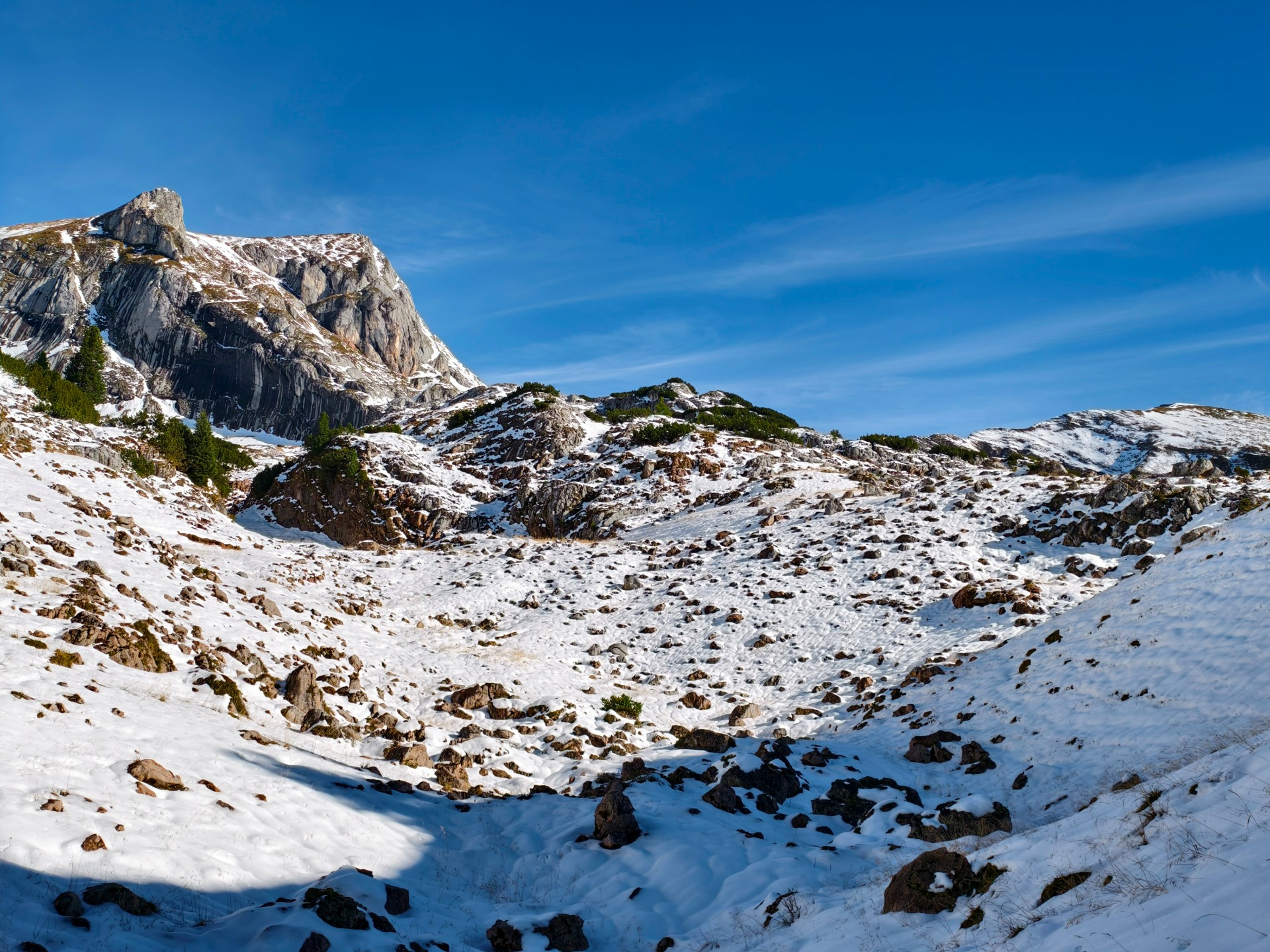 Problem: Das Gschöll wird beidseitig durch Felswände umrahmt, daher gestaltet sich der direkte Abstieg vom Buchbergl in den Graben sehr schwierig, zumal auch noch eine Latschenzone mit meterhohen Legkiefern zu überwinden ist. Es gibt nur einen schmalen Korridor, der den Hinuntergang ins Hinter-Gschöll erlaubt – den habe ich aber nicht gefunden, außerdem bei Schnee???? So entschied ich mich für die sicherste Variante und die war auch nicht "ohne" – Abstieg ins Vorder-Gschöll: Steilgelände, patziger Schnee, Latschen, Felsen – im Wesentlichen folgte ich zuerst einer Gamsspur, danach einer Hasenspur