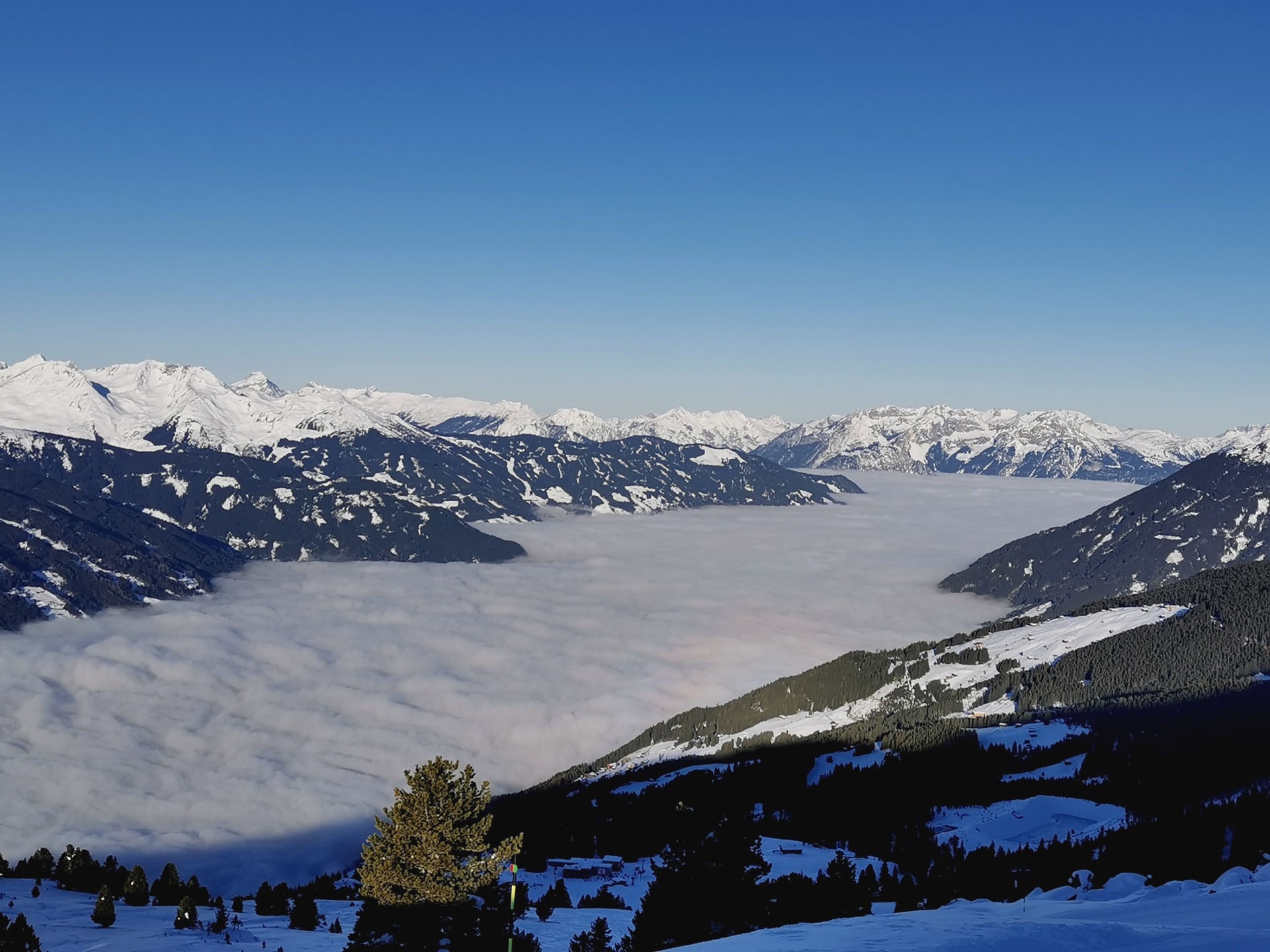 Highlight: Faszinierender Blick auf den Nebelzug im Zillertal - in den Tälern Nebelbrühe, auf den Bergen wolkenlos und warm, Sonne pur - ausgeprägte Inversionslage.
